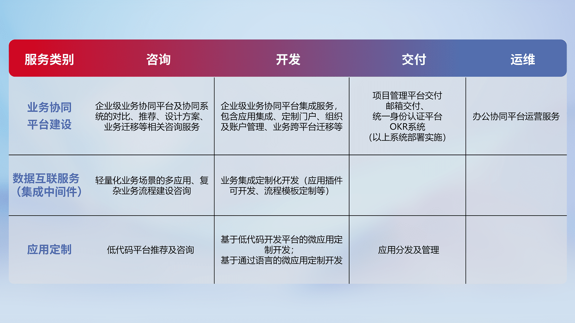 针对钉钉、、、、企微、、、、IDaas等平台级产品提供产品的规划、、、、方案、、交付、、、、定制化开发等服务,,实现如统一协同办公、、、智能客户服务、、、混合会议管理、、、、智能数据查询、、、等业务场景,,,,实现数字化转型。。。