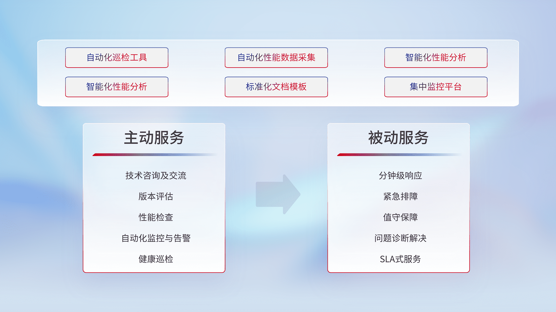 智能化工具和标准化文档,,保障服务质量,,,提供主动服务(包含技术咨询、、版本评估、、、、性能检查、、、自动化监控与告警、、、健康巡检)和被动服务包含(分钟级响应、、紧急排障、、、、值守保障、、问题诊断解决、、SLA服务)。。。